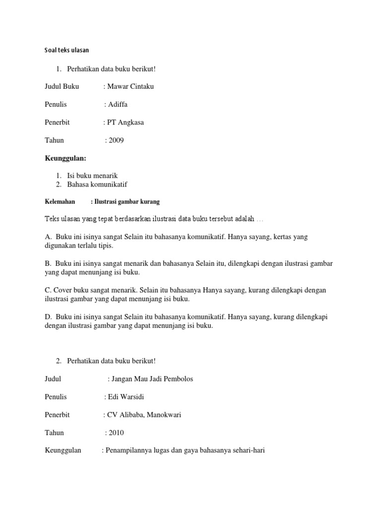 Silakan klik bahasa indonesia kelas 8 pembahasan soal latihan teks ulasan resensi smp bina insan mandiri untuk melihat artikel selengkapnya. Pentingnya sebuah karya film yang direstorasi itu sendiri adalah bagaimana kita bisa menyaksikan. Soal latihan bahasa indonesia semester 2. Latihan prediksi soal ujian nasional (un) kelas 9. Teks ulasan adalah teks yang berisi ulasan, evaluasi atau penilaian, kritik, dan tanggapan terhadap suatu karya, baik karya sastra maupun karya nonsastra.